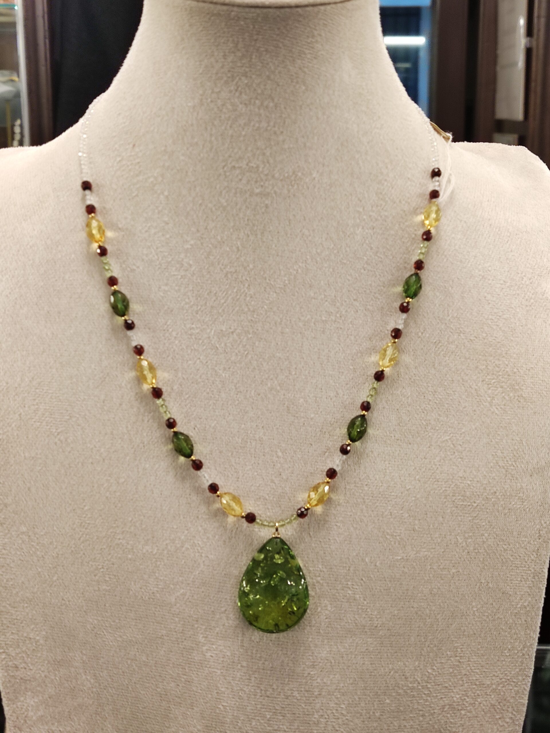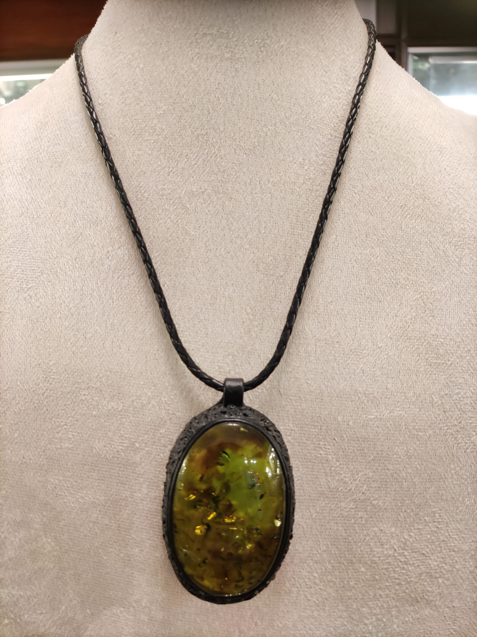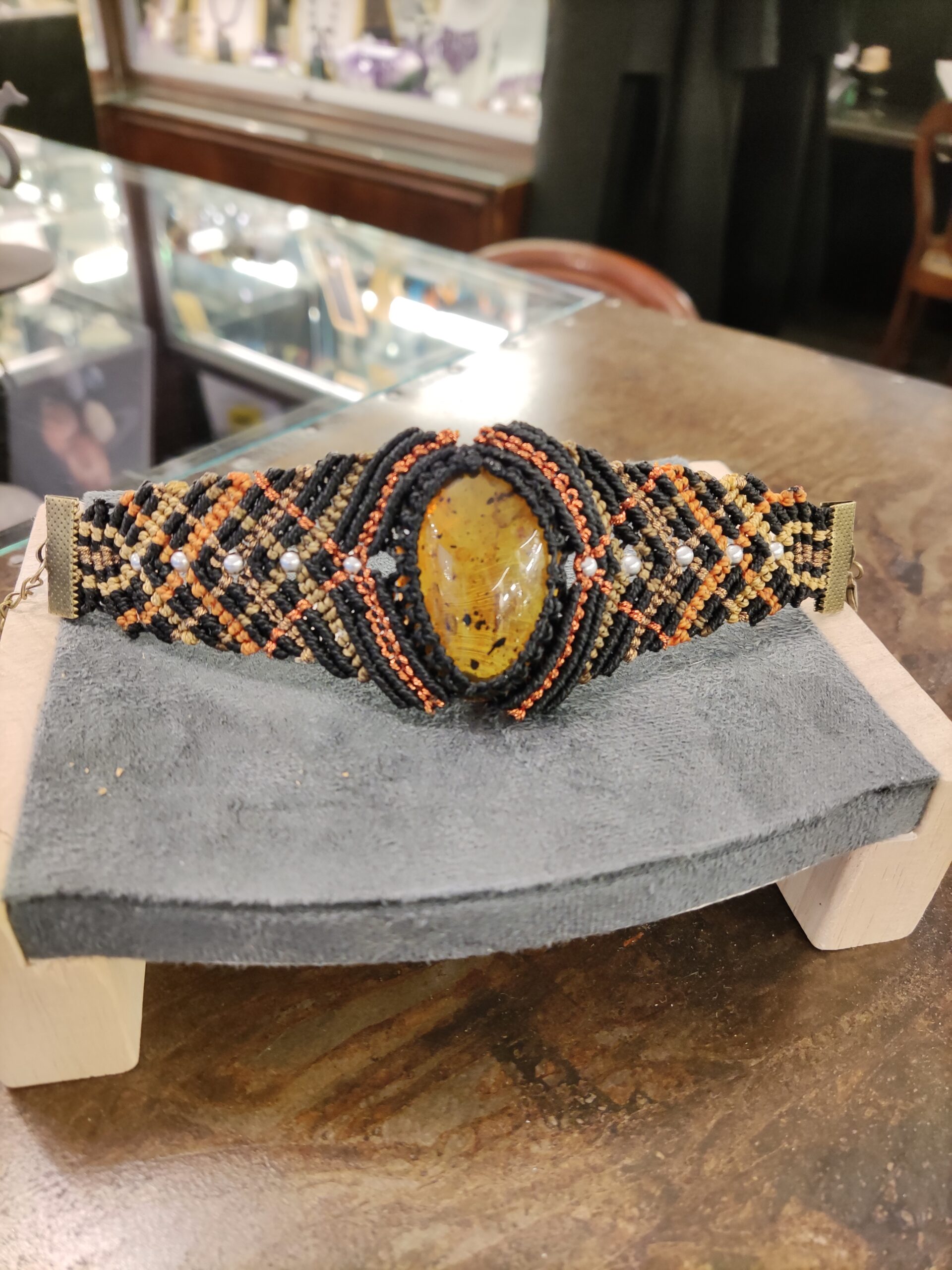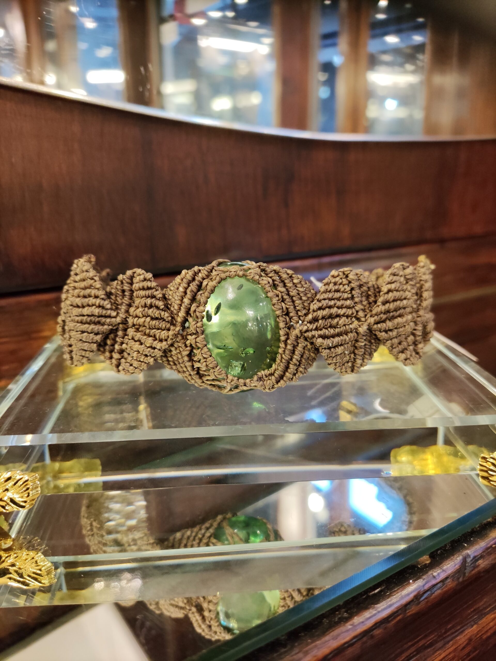 Bracciale in ambra verde lavorato a macramè con chiusura lavorata in bronzo.