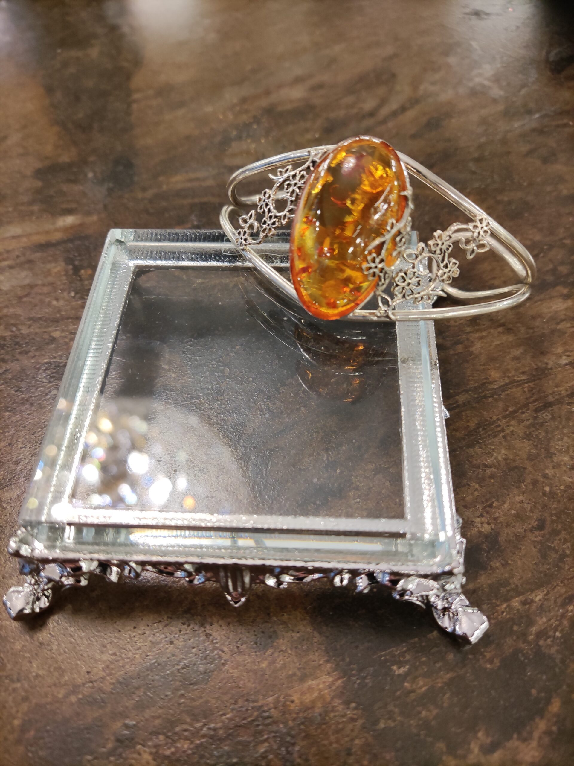 Bracciale in ambra baltica completamente montato in argento 925 con ricamo a fiori. Regolabile.