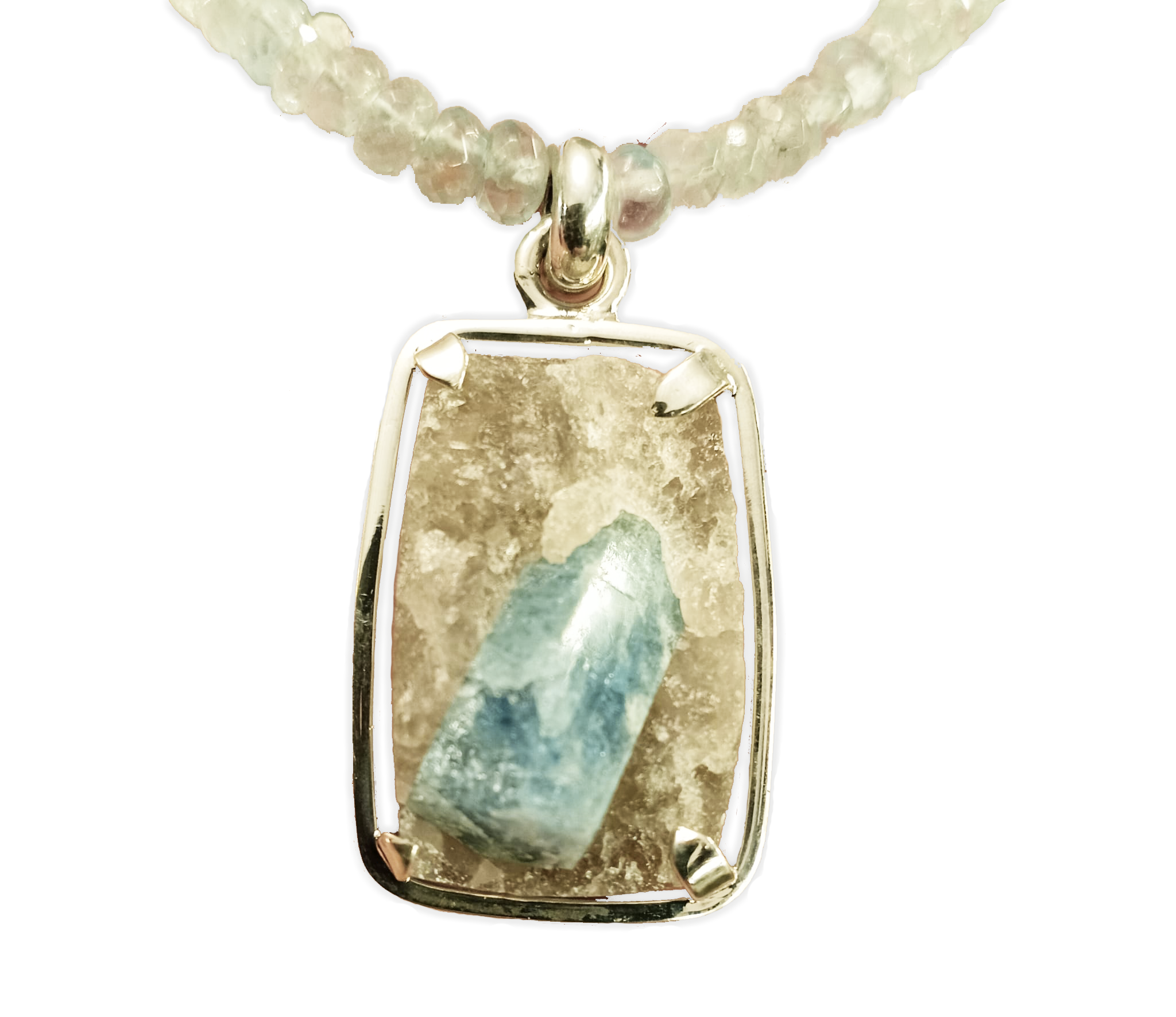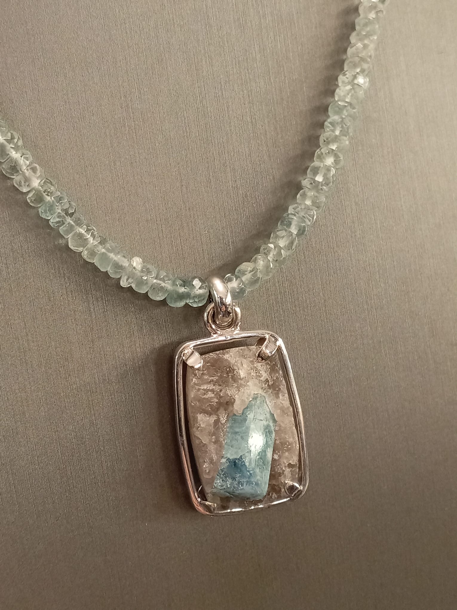 di acquamarina che si infrange nel quarzo. Anche il girocollo è stato montato interamente con cristalli di acquamarina