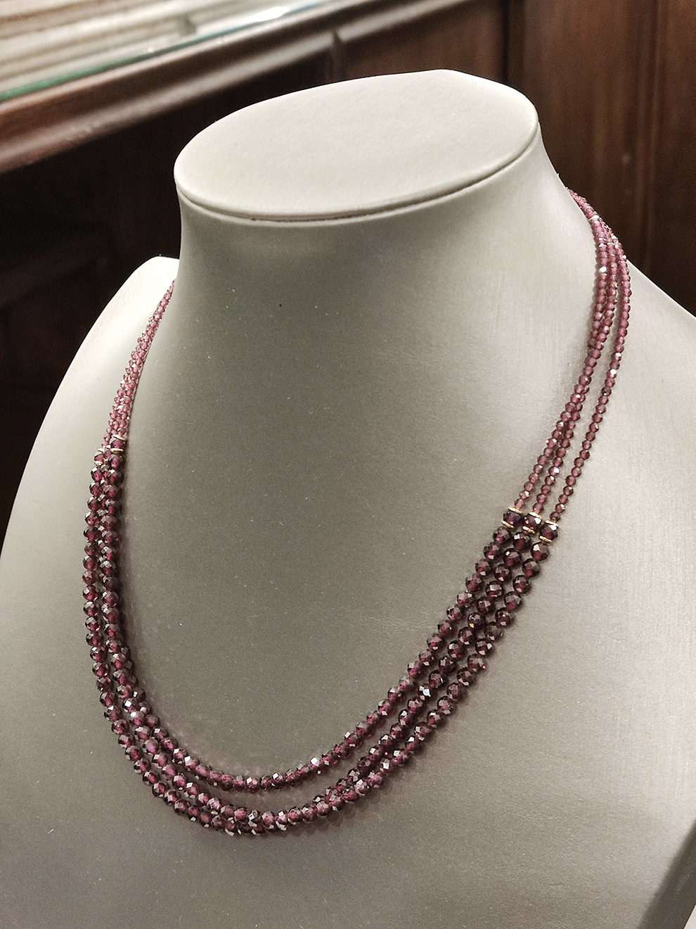 Collana a 3 fili a scalare in granato con intercalari in argento dorato e chiusura regolabile in argento dorato con moschettone.