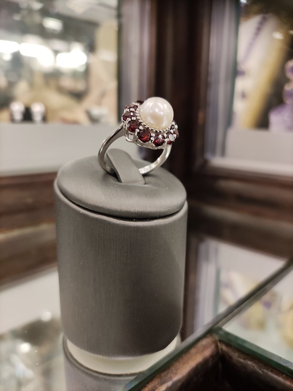 Anello in argento 925 rodiato con perla di acqua dolce e pietre di granato naturale taglio rotondo. Misura 16.5 / 17
