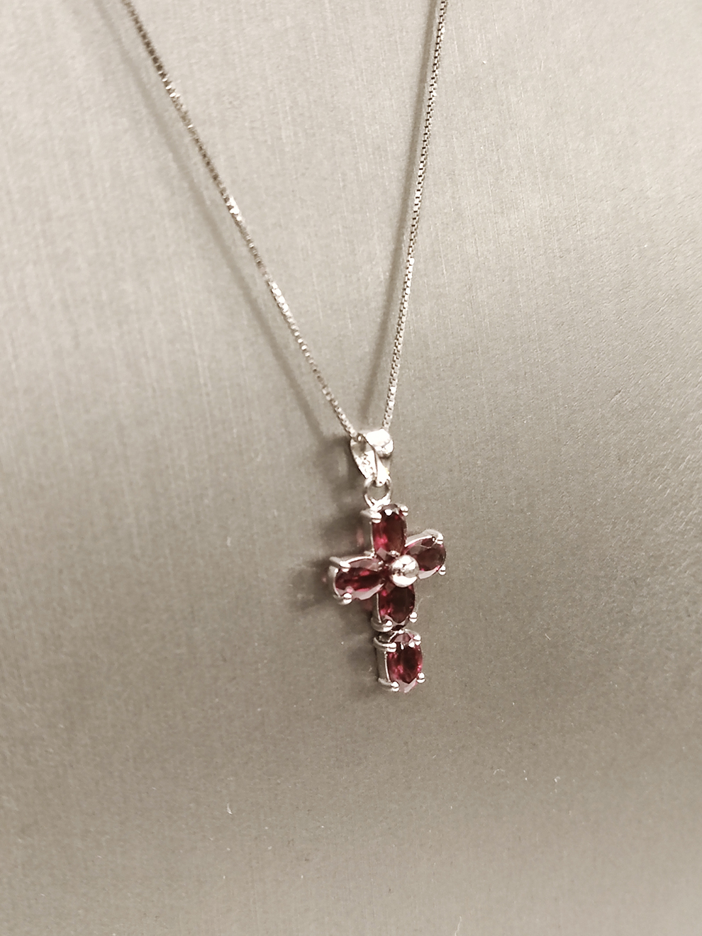Centrale rifinito con perla Coin piatta, argento dorato e pietra sfaccettata sempre in granato.